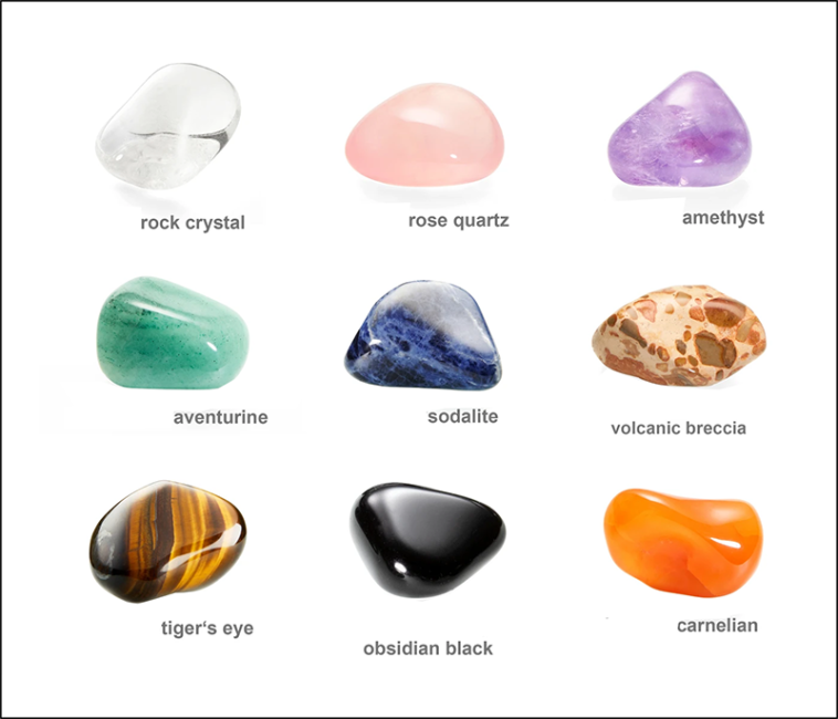 Cristal de rocha - Quartzo rosa - Ametista - Aventurina verde - Sodalita - Olho de tigre - Obsidiana negra - Cornalina - Jaspe brechado vulcânico