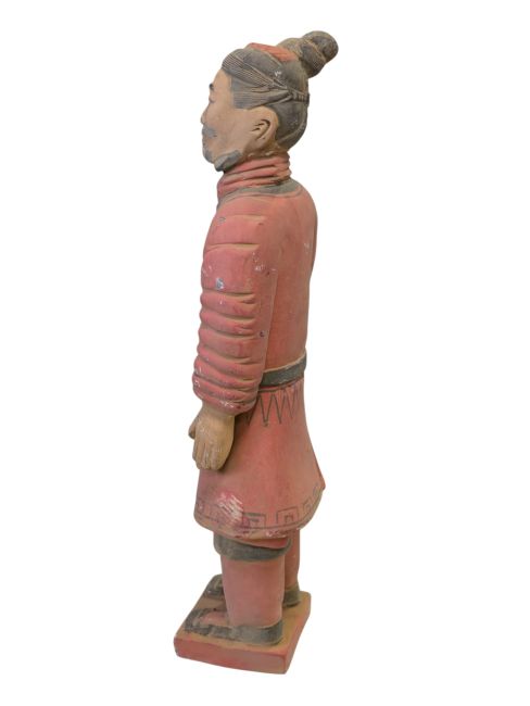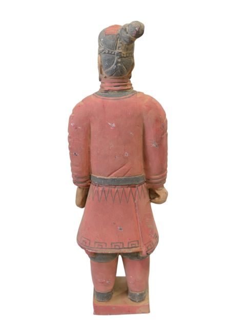 Guerreiro em traje de batalha: Essas estátuas representam uma categoria de soldado entre as estátuas do exército de terracota. Geralmente são retratados como soldados vestidos com trajes de batalha simples. Comparados a outros tipos de guerreiros de terracota, costumam ter menos equipamentos e ornamentos. Esses soldados provavelmente eram soldados de infantaria comuns, encarregados de guardas e outras tarefas militares gerais, e não comandantes de alta patente ou membros de forças especiais. Sua representação pode refletir a imagem típica dos soldados comuns do antigo exército chinês, com roupas simples, mas com coragem e determinação inabaláveis.