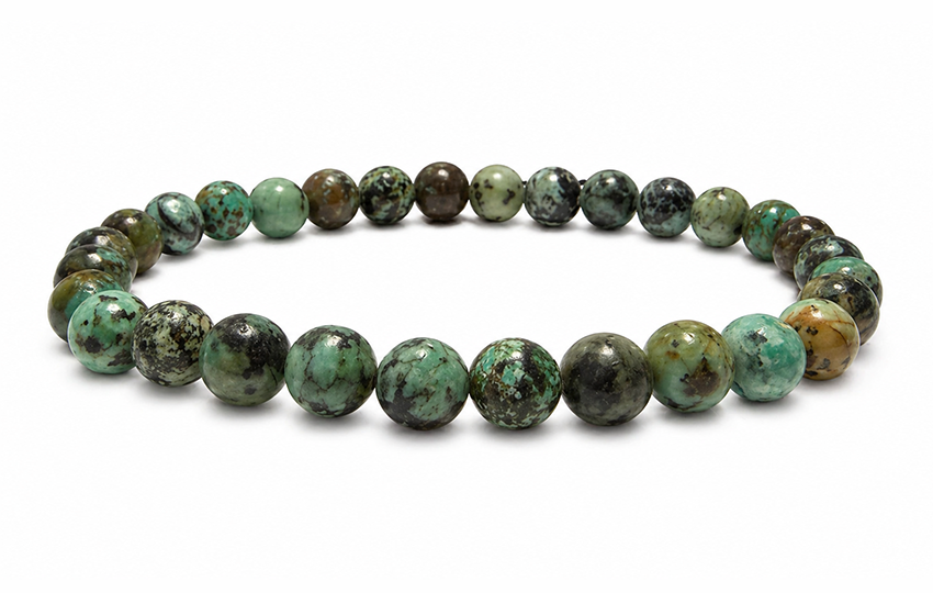 Esta pulseira de turquesa natural da África é composta por contas redondas de 6 mm , dispostas em um elástico confortável, ideal para uso diário. Seus tons naturais, que variam do azul-esverdeado ao verde profundo dependendo da conta, fazem dela uma joia original e luminosa, fácil de usar sozinha ou combinada com outras pulseiras de pedras naturais.