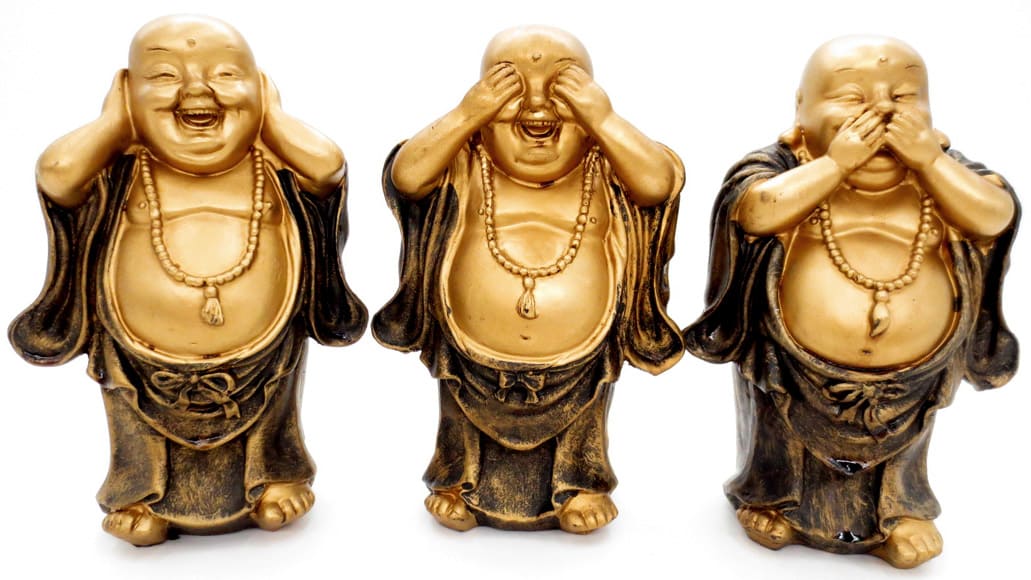 Conjunto de 3 Budas da Sabedoria Risonhos dourados 14cm